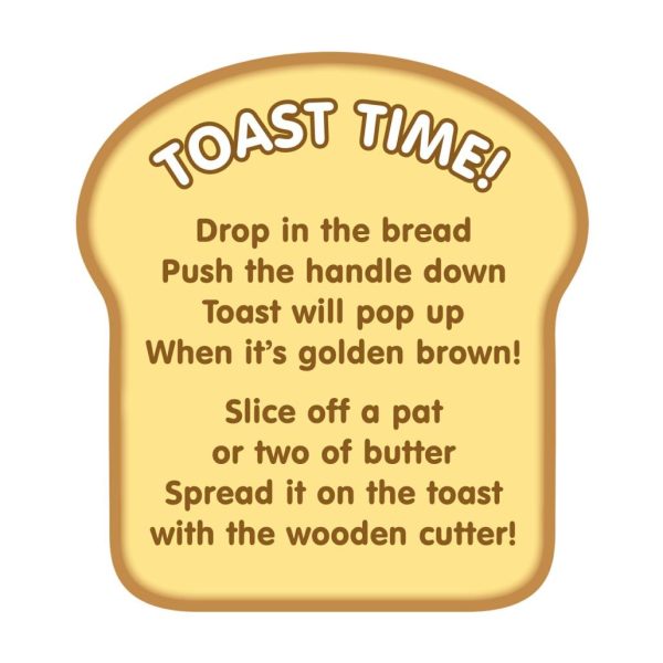 - Includes wooden toaster, 2 slices of bread, 4-pat stick of butter, butter dish, knife, reusable activity card