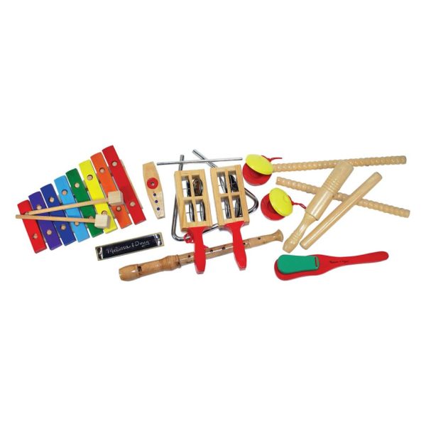 - Set includes xylophone and 2 mallets, kazoo, triangle and striker, 2 castanets, a set of rhythm sticks, tone block and strike