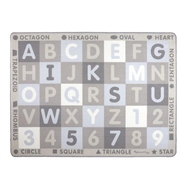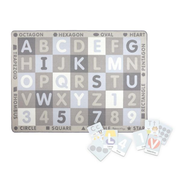 - Generously sized educational play rug featuring sophisticated neutral tones (soft grays and calming light blues) with beautifully illustrated alphabet, numbers 1-9, and geometric shapes