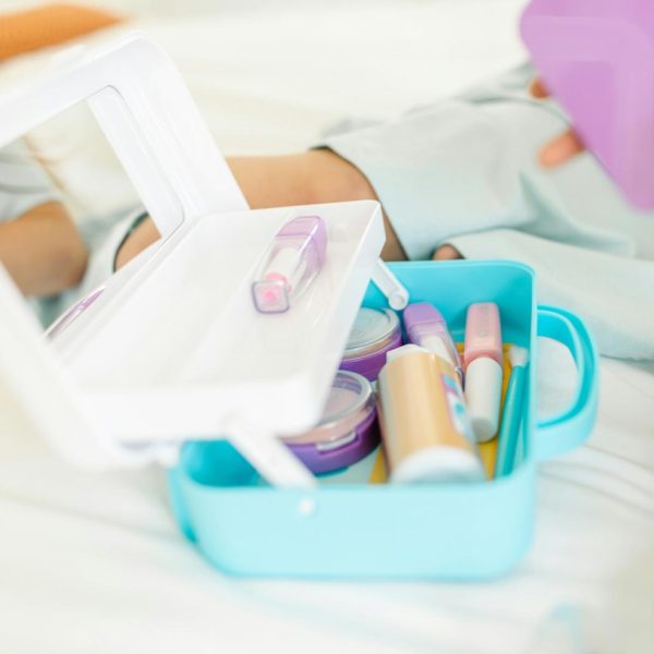 - Great for mess-free imaginative play: Realistic looking, but ITEMS DO NOT CONTAIN COSMETICS AND NO COLOR IS TRANSFERRED. Includes empty “foundation” pump bottle, compacts for pretend two-tone blush and powder, compact for pretend glitter, play lip gloss and 2 play lipsticks with removable caps, and