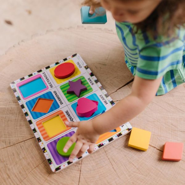 - 8-piece wooden puzzle featuring vibrant colors, engaging patterns and classic shapes