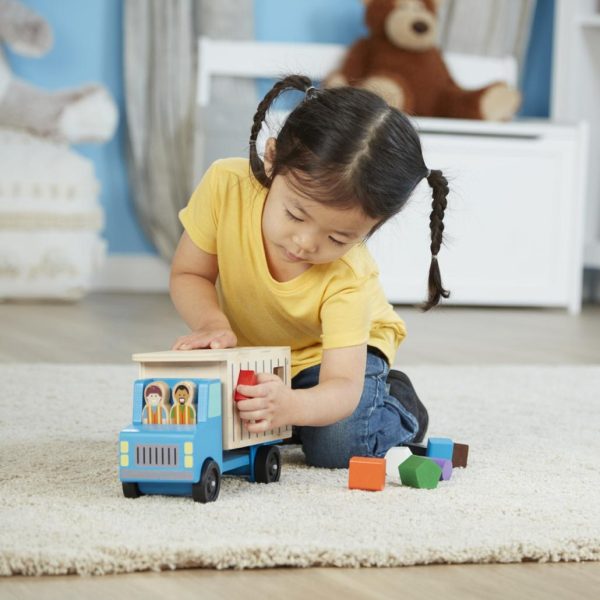- Interactive back door lifts and truck bed tilts to dump blocks for endless fun