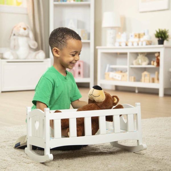 - White wooden rocking play cradle for dolls and stuffed animals up to 20 inches tall