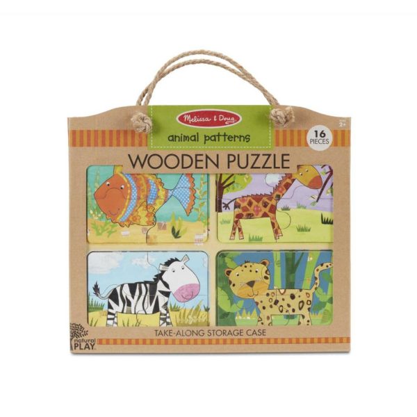 - Four 4-piece wooden puzzles with an animal theme; animals include fish, giraffe, zebra, and cheetah