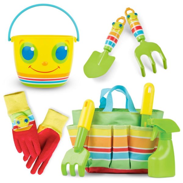 - Durable pail has attached handle and smiling face; cultivator and trowel are made of metal with friendly bug-faced easy-grip handles